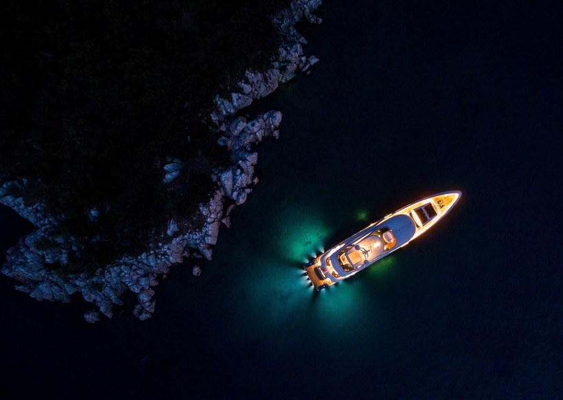 Ночное море, подсвеченное огнями яхты.