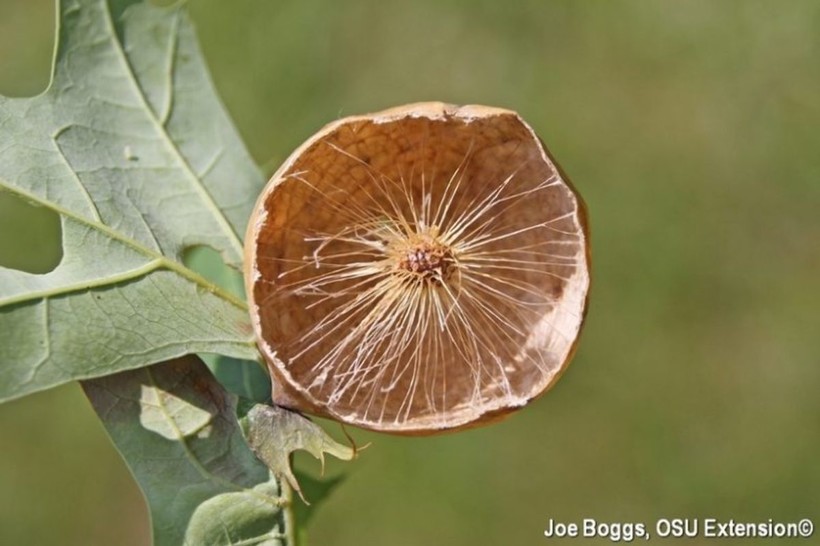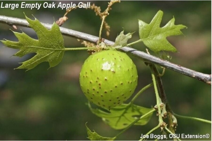 Природа тоже частенько загадывает человеку ребусы. Вот такой небольшой полый шарик был обнаружен под деревом внимательным отдыхающим. Биологи объяснили, что это чернильный орешек, образуемый личинками насекомых.