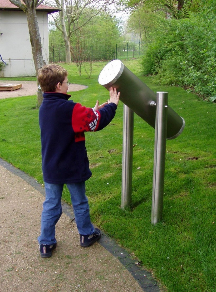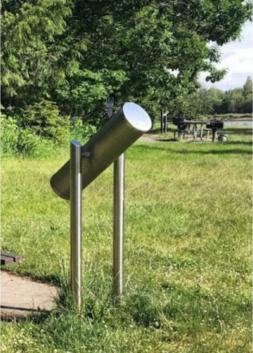 Эти цилиндры из металла привлекли к себе внимание прохожих в парке. Если цилиндр повернуть, он издает звуки, похожие на шум дождя.