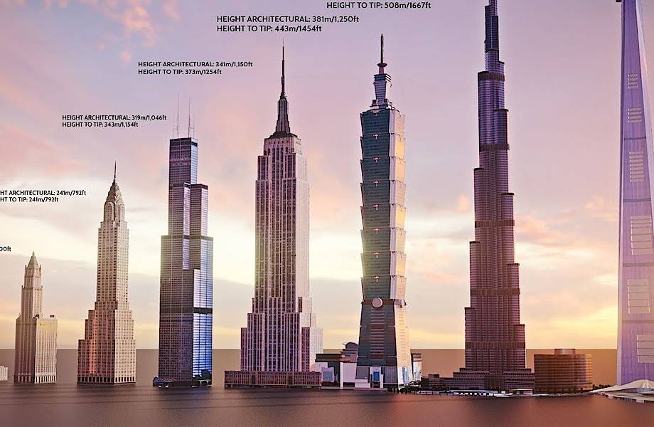 Замечали ли вы: когда дети играют в пирамидку или строят что-то из кубиков, то им нравится достигать максимума — чем выше сооружение, тем больше восторга. Взрослые — это большие дети, и чувство максимализма им также присуще. Со времен как люди освоили работу по камню и дереву, они строят высокие здания. Наши далекие предки мастерили бревенчатые башни, где запирали девиц, а европейцы возводили каменные замки. Автор ролика, представленного ниже, смоделировал интересную 3D подборку самых высоких строений в мире, которые были возведены с 1901 года, а также тех, которые только готовятся предстать перед нами.