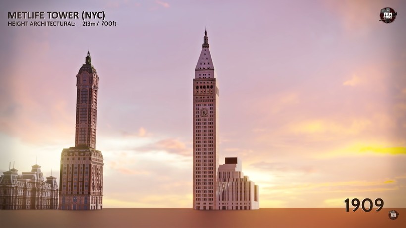 Самым огромным зданием в 1901 году был Сити Холл в городе Филадельфия, США (167 м), и он стал началом эпохи небоскребов в Америке. На строительство следующего у американцев ушло 7 лет, и в 1908 году в Нью-Йорке появился Зингер-билдинг (187 м). Идея понравилась властям, и они за год возвели еще одно громадное сооружение — башню Метлайф (213 м). Дальше небоскребы в «Большом яблоке» стали расти как на дрожжах, были построены такие здания, как Вулворт-билдинг (238 м), Банк Манхэттен Траст (262 м) и Крайслер-билдинг в 1930 году (319 м). Рекордсменом среди них был Эмпайр-стейт-билдинг с рекордной высотой в 443 метра. Выше него были только башни-близнецы Всемирного торгового центра (527 м), но после теракта 2001 года, Эмпайр-стейт-билдинг вновь стал самым высоким небоскребом города Нью-Йорк.