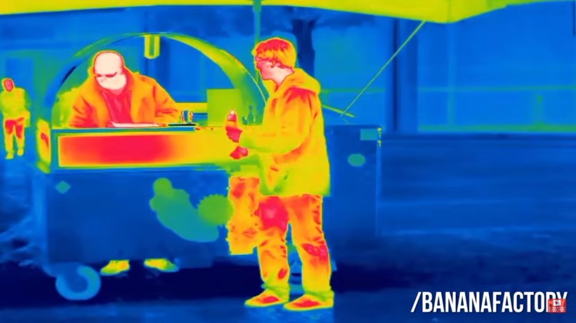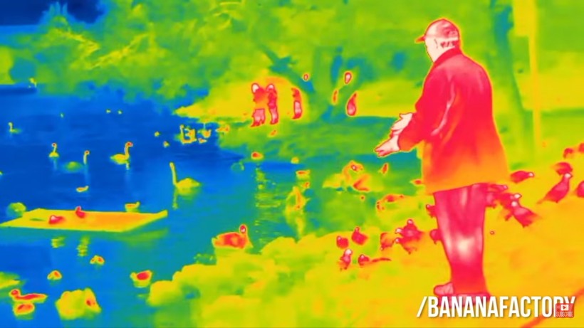 В видео, представленном ниже, тепловизор был использован в качестве научно-развлекательного эксперимента и показывает нам, как выглядит наша жизнь и окружение в инфракрасном свете. Люди, животные, предметы, транспорт — у всего свой разный уровень выброса тепла. Под девизом «Жизнь — это тепло» авторы ролика показали людей в привычных нам ситуациях: во время покупки еды, при поездке в транспорте, кормлении птиц на пляже. Мы работаем, ходим, едим, пьем и все это время вырабатываем тепло и отдаем его окружающим.