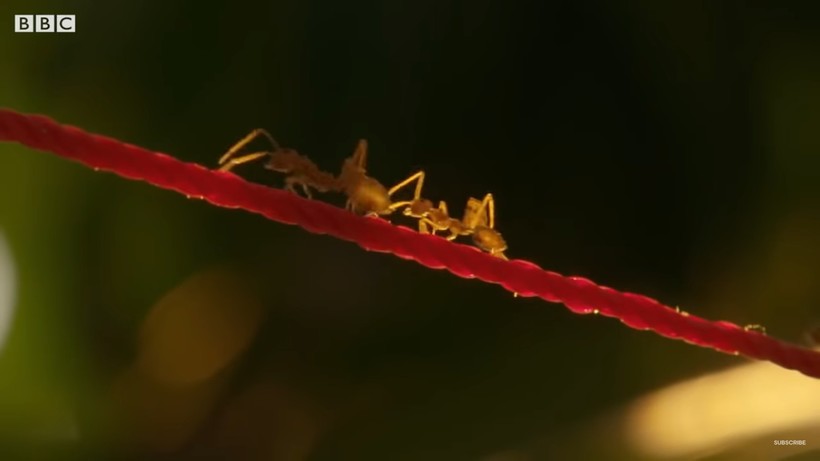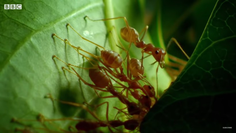 «Чтобы склеить листья вместе, группа рабочих муравьев трудится как единое целое. Проторенные дорожки помогают насекомым быстро перемещаться по территории. Чтобы удерживать всю конструкцию вместе, муравьи полагаются на самых молодых членов группы — личинок. Когда личинка находится на последней стадии развития, она производит пряди шелка, которые являются идеальной клеевой основой. Всего за несколько часов новый дом из листьев завершен. Их гнездо оказывается на манговом дереве, но это не обычный сад, а ферма», — комментирует диктор.