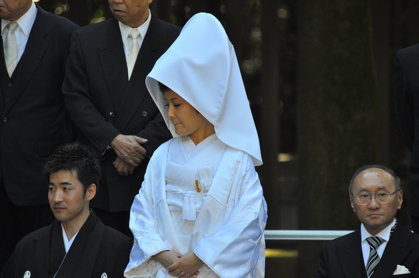 Всю церемонию можно условно разделить на две части. Во время первой, проходящей, как правило, в синтоистском храме, участвуют только близкие родственники новобрачных. На невесте — белое кимоно (символ чистоты перед богами), на голове — высокий парик, на который крепятся... рожки, как символ ревности. Их специально прячут под особенной косынкой цунокакуси, давая понять невесте, что ревность — нежелательное чувство, его лучше прятать как от мужа, так и от окружающих. Жених же облачен в темное кимоно, украшенное фамильными гербами.
