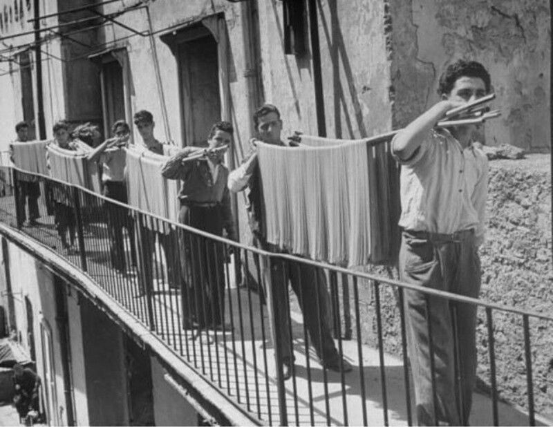 «Торре-Аннунциата (порт около Неаполя) живет макаронной промышленностью. Пшеницу доставляют из России на пароходах; 300 рабочих порта — грузчики, лодочники, носильщики, весовые — разгружают зерно на берег; 500 мельников превращают его в крупу в 14 крупных паровых мельницах; еще 800 человек превращают крупу в макароны на 54 макаронных фабриках...»