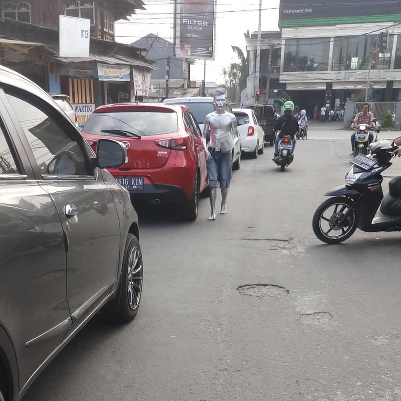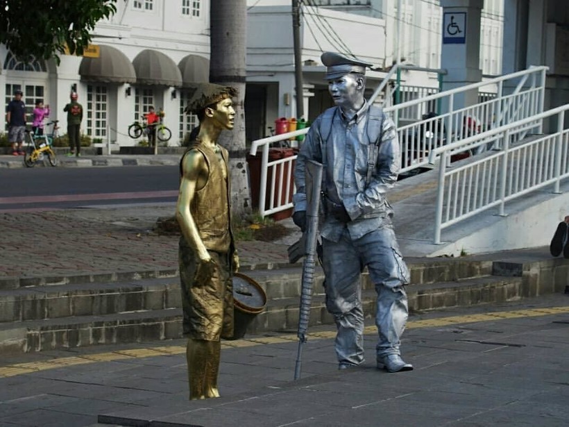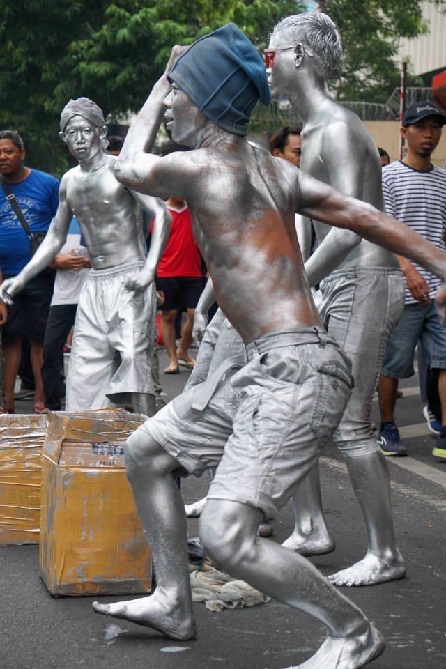 Только, увы, до артистов они явно не дотянули: если, например, прогуливаясь в Барселоне, можно увидеть настоящее уличное искусство, то в Азии это всего лишь нищие, покрашенные краской. Они не будут наносить на свое тело грим на протяжении двух часов, стараясь максимально сымитировать бронзовую или мраморную скульптуру, и уж тем более не согласятся стоять долгое время неподвижно. В Индонезии серебряные люди просто разгуливают по улицам городов и занимаются тем, что у них получается лучше всего: просят копеечку.