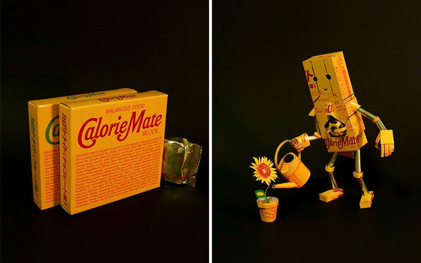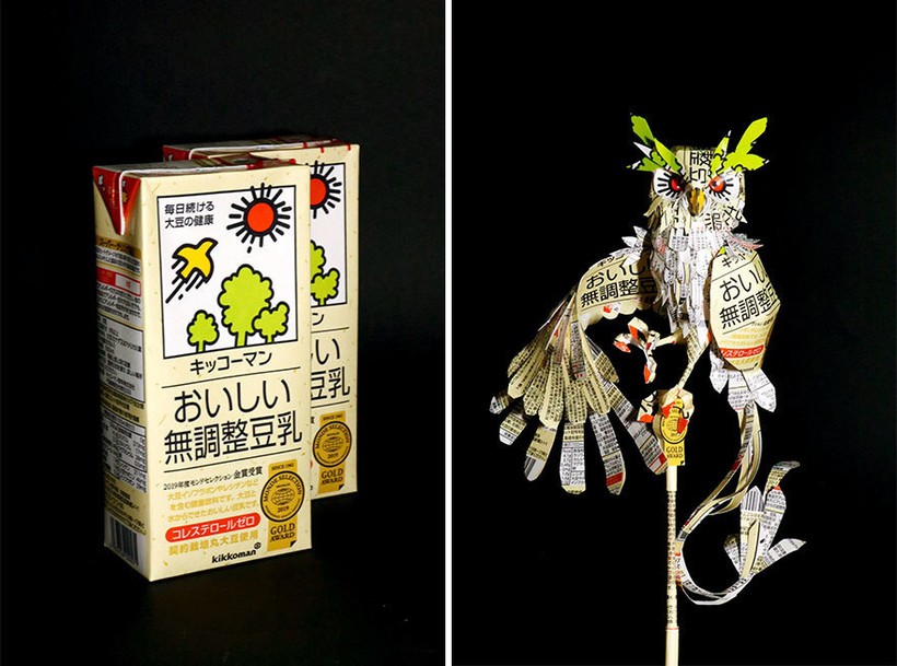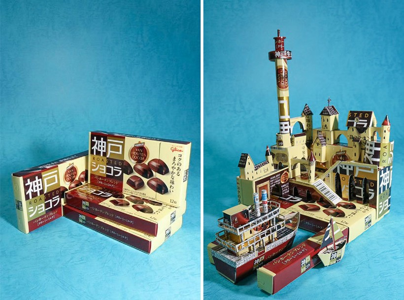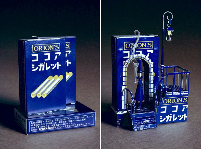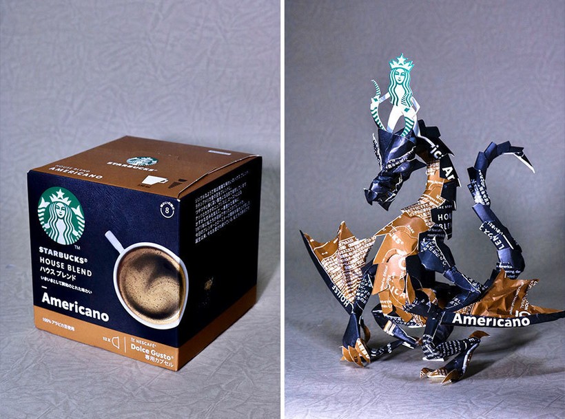 В ход идут коробки от чая, сока, печенья, конфет, в общем любой картон, который мог бы добавиться к миллиардам тонн отходов, оставляемых людьми. Но его умелые руки превращают обычный бытовой мусор, который должен оказаться на свалке, в маленький городок, в самурая или в чудесную скрипачку. Каждая крохотная скульптура невероятно детализирована, а дизайн коробки словно продолжается в фигурке. Так, например, упаковка Starbucks, логотипом которой является русалка Сирена, превратилась в дракона, которым управляет старбаксовская Кхалиси.