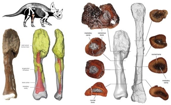Примеры ископаемых останков этого вида обнаружили несколько десятилетий назад, но только сейчас ученые смогли распознать заболевание. На момент обнаружения, в 1989 году, кости считали поврежденными в результате перелома, который плохо заживал. Однако потом исследователи обратили внимание на странную форму кости и нашли остеосаркому, злокачественную раковую опухоль в малоберцовой кости.