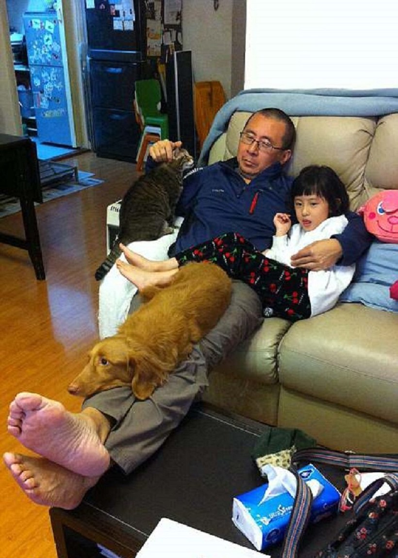 Первое случайное фото было сделано, когда дочка была еще совсем крохой. Тогда, отдыхая рядом с папой на диване у телевизора, она уснула. Кошка и собака тоже не упустили случая подремать и с комфортом улеглись возле хозяина.