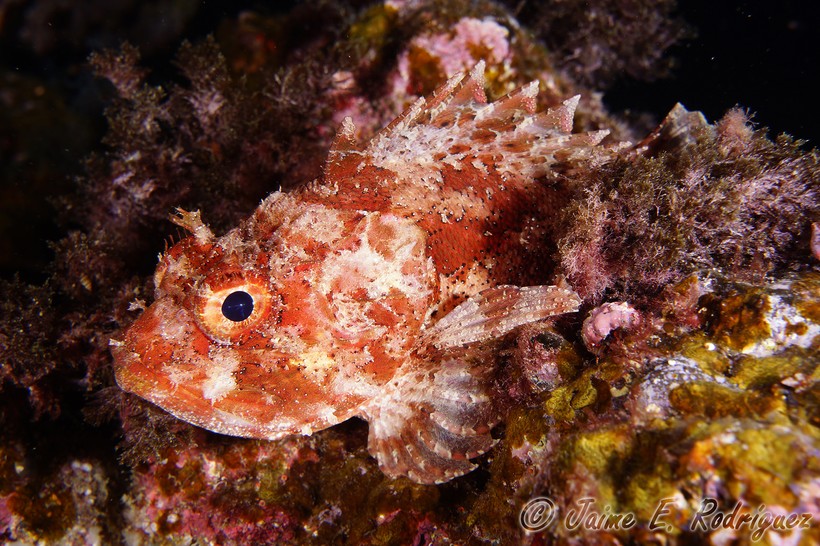 Скорпена или, как ее еще называют, морской ерш любит проживать у покрытых камнями и известняком берегов на глубине порядка 35 метров, где она может хорошо замаскироваться. Выглядит морской ерш довольно страшно. И не зря. Помимо когтистых зубов скорпены, наибольшую опасность представляют ее ядовитые железы, расположенные на плавниках. Стоит быть с ней поосторожнее.