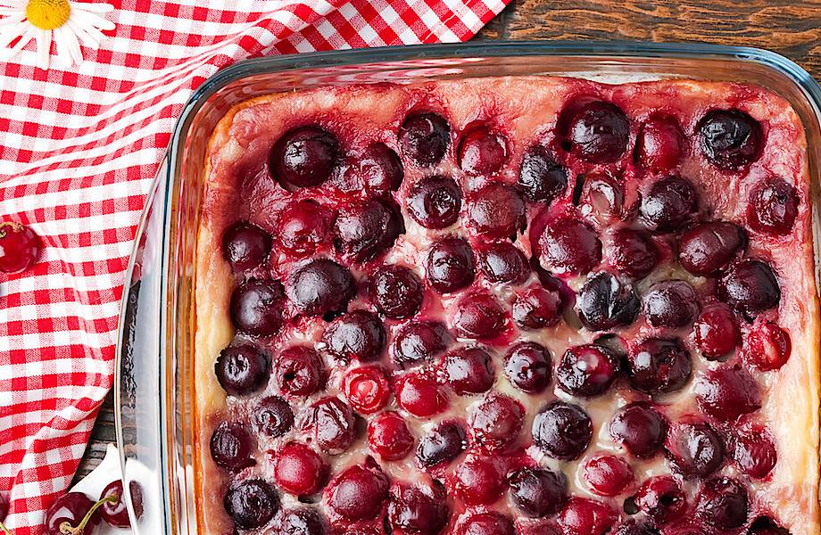Вишня может быть свежей или замороженной (в этом случае ее нужно достать из морозилки за полчаса до начала приготовления): полкилограмма ягод раскладываем по дну формы и засыпаем двумя столовыми ложками сахара. 5 куриных яиц взбиваем в пену: чем дольше, тем воздушнее будет тесто. Снимаем цедру одного лимона, трем или в блендере смешиваем с 8 столовыми ложками сахара. Лимонную смесь смешиваем с 4 столовыми ложками с горкой муки, щепоткой соли и ванилина. В центр сливаем взбитые яйца и размешиваем до однородности. Постепенно добавляем 350 граммов сметаны и 1 стакан молока. Полученным тестом заливаем вишню в форме и ставим на 35 минут в разогретую до 180 градусов духовку. На готовом клафути образуется золотистая корочка, а по дому поплывет аромат спелой вишни.