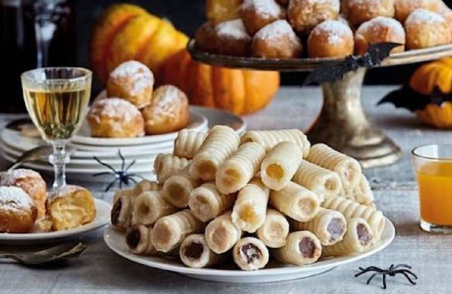 Подготовьте начинку. Нагрейте 3 стакана воды в кастрюле среднего размера (для водяной бани). Налейте воду и сахар в другую небольшую кастрюлю и доведите до кипения, чтобы получился сироп. Пока вода закипит, разбейте яйца в жаропрочную посуду и взбейте. Медленно влейте сироп в яйца, помешивая вилкой или металлическим венчиком. Затем перемешивайте начинку на водяной бане, пока она не станет очень густой, как пудинг. Выложите начинку из желтка в кондитерский мешок и заполните марципановую трубку с каждого конца. На трубочке можно сделать бороздки вилкой. Пробовать их можно не только на День всех святых, но и круглогодично!