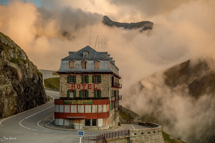 На обложке книги гордо красуется закрытый несколько лет назад отель в швейцарских Альпах с красивым названием «Бельведер», который расположен неподалеку от Ронского ледника. Сейчас отель и сувенирный магазин при нем работает только в летнее время. Атмосферный отель лишился почти всех своих гостей из-за таяния ледника, однако, остался не менее очаровательным в своей заброшенности.