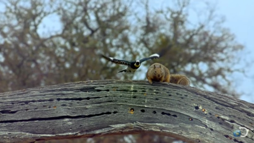 Этот затейливый стук привлекает не только пришедших на прогулку в лес людей, но и соседей птиц по деревьям. Белки не упускают момента украсть что-нибудь у птиц. Как только дятел улетает со своего дерева, в кадре появляется пушистый воришка. Благодаря профессиональной съемке создается впечатление, будто на экране развиваются события какого-нибудь блокбастера. Белка быстро хватает самый вкусный желудь и принимается его есть прямо на месте преступления. Это стало главной ошибкой, потому что дятел заметил происходящее и сразу же бросился спасать свои припасы. Птица отгоняет от желудей наглую белку, которая совсем не собирается никуда уходить. Однако после того, как дятел грозится применить свой острый клюв в качестве оружия, обладательница пушистого хвоста скрывается в неизвестном направлении. А как бы вы поступили на месте дятла?