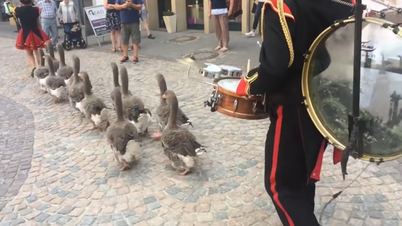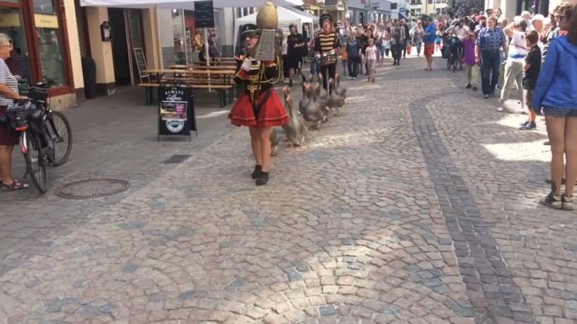 Гуси гордо маршируют по главной улице немецкого городка, открывая музыкальный фестиваль.