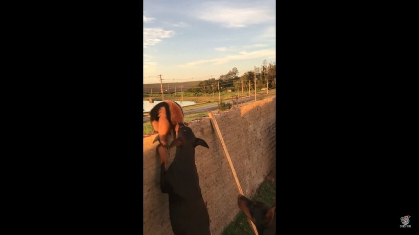 В дикой природе для четырехпалых муравьедов найдутся такие противники, как пумы и ягуары, но в ролике ниже муравьеду досаждали доберманы, которых очень заинтересовал необычный зверек. Автор ролика — бразилец, который вышел на утреннюю прогулку с собаками. Он снял, как тамандуа, сидевший на ограждении недалеко от озера, ловко встал на задние лапы, тем самым предупреждая собак, что готов к бою. Лапы тамандуа раскинул так, будто хочет обняться, но его шипение говорило об агрессии: доберманы подошли слишком близко.