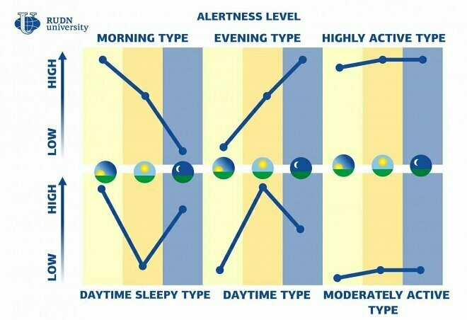 То, что люди редко укладываются в эти два типа, догадаться несложно. Несмотря на то, что люди в сущности устроены очень похоже, они могут иметь разные ритмы жизни. Само понятие «жаворонок» не только определяет время, когда ты встаешь и ложишься, но и самочувствие в течение дня. И то же самое касается сов. Даже они бывают разными, и далеко не каждая способна понять другую. Объяснить это явление попытались ученые из Российского университета дружбы народов (РУДН).
