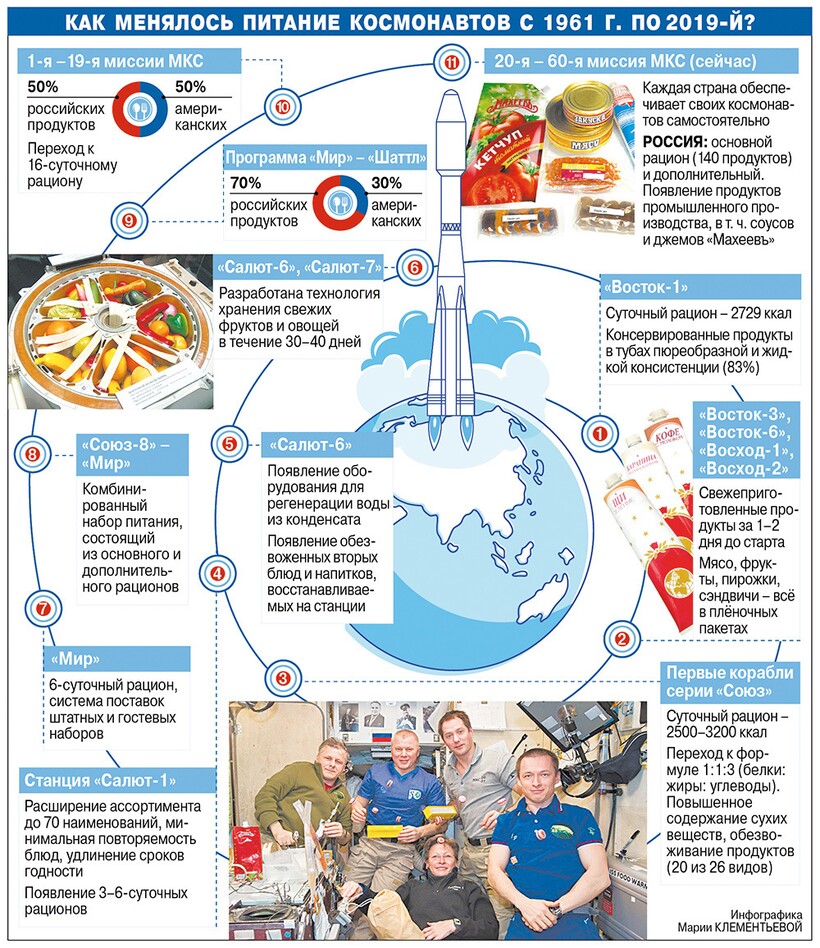 В нашей стране полноценным рационом людей на орбите обеспечивает НИИ пищеконцентратной промышленности и специальной пищевой технологии Федерального исследовательского центра питания, биотехнологии и безопасности пищи. В настоящее время ассортимент различных космических блюд расширен до 200 наименований. Из них 90 входят в суточный рацион питания жителей космической станции.