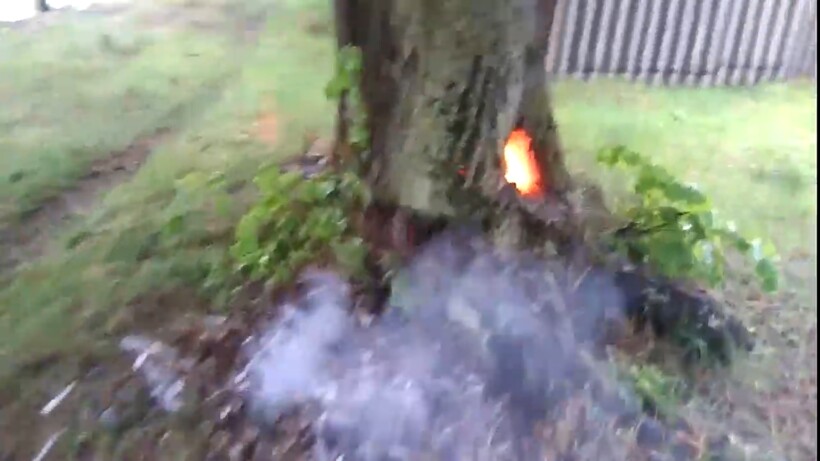 Молния проделала в стволе дерева огромную щель, из которой вырываются языки пламени.