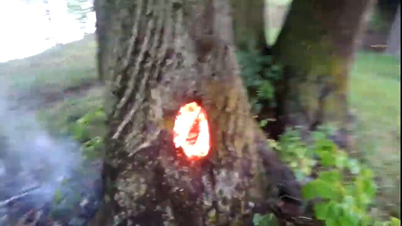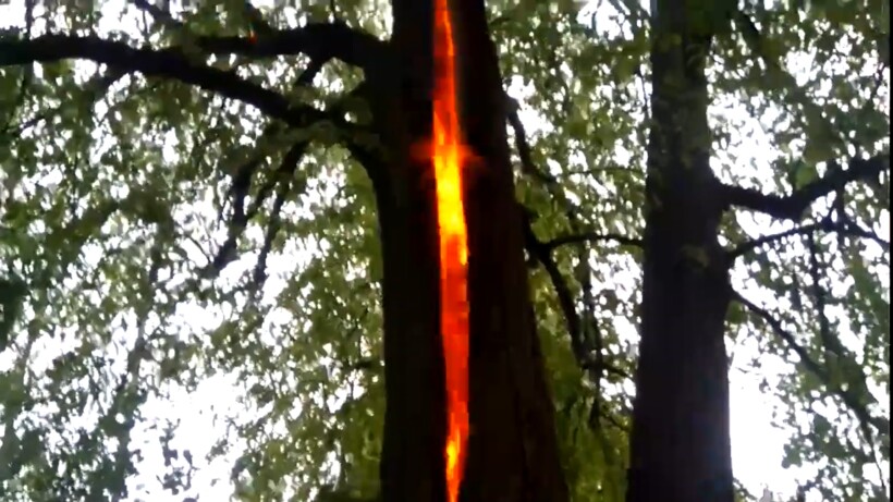 Молния может поразить абсолютно любое дерево. Удар молнии расколол напополам дерево из видеоролика. Внутри разжегся сильный огонь, а пламя моментально поднялось к самой макушке. Зрелище это по-настоящему пугающее и мистическое. Если немного включить фантазию, то можно представить, что над пылающим деревом вот-вот появится гигантский глаз, как во «Властелине колец». Такой пожар внутри одного дерева может стать причиной превращения в пепел целого леса, поэтому будем надеяться, что сразу после окончания съемки автор видео вызвал к месту происшествия пожарных. А вы когда-нибудь видели расколотые молнией деревья?