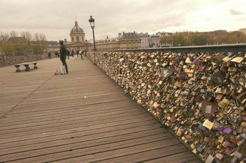 У всех влюбленных парочек обязательным считалось повесить замочек, олицетворяющий их любовь, на этот мост Искусств. Причем вешают замки не только парижане, но и туристы из других стран. И вот однажды мост не выдержал такого потока любви на себе и чуть не обвалился. После этого происшествия правительство Парижа строго-настрого запретило дотрагиваться до моста, вешая на него замки. Оставили лишь пару решеток, которые, как и прежде, увешаны замочками.