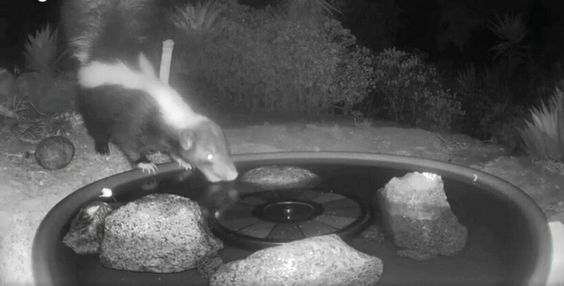 Фонтанчик, кстати, встречает лесных гостей не только днем, но и ночью. Как раз в ночное время круглосуточным сервисом решил воспользоваться скунс.