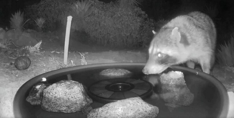 Как и предыдущий зверек, енот тоже решил попить водицы, наблюдая отражающийся лунный свет в конструкции, которая вполне могла выполнять для него функции пруда. Правда, позже его что-то отвлекло от питья, вероятно, другие животные в очереди уже начали бунтовать.