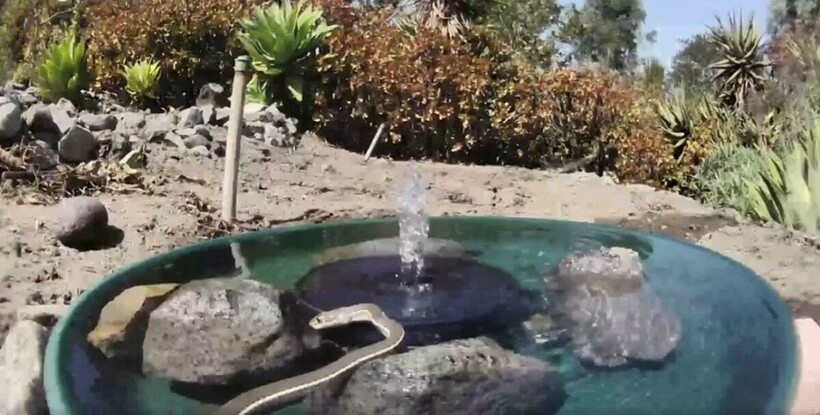 К фонтанчику кто только не заявлялся, но змея действительно удивила пользователей. Сначала она немножко попила водички, а позже и вовсе воспользовалась всеми преимуществами своего телосложения и поползла в сам водопой. Так, конструкция стала для нее своеобразным бассейном, где можно приятно освежиться в жаркие деньки.