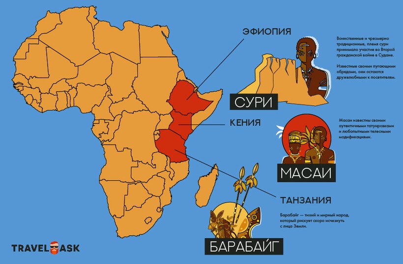 Племя обитает в экзотичных селениях Эфиопии. Жестокие и властные, они имеют воинственный вид и выделяются среди других африканских народов благодаря своим невероятным телесным модификациям: губному диску, необычным татуировкам и фантастическим шрамам.