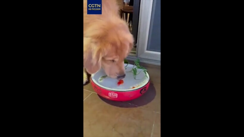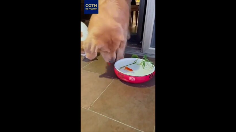 Собака быстро приходит на помощь вытащенной из аквариума котом рыбке.