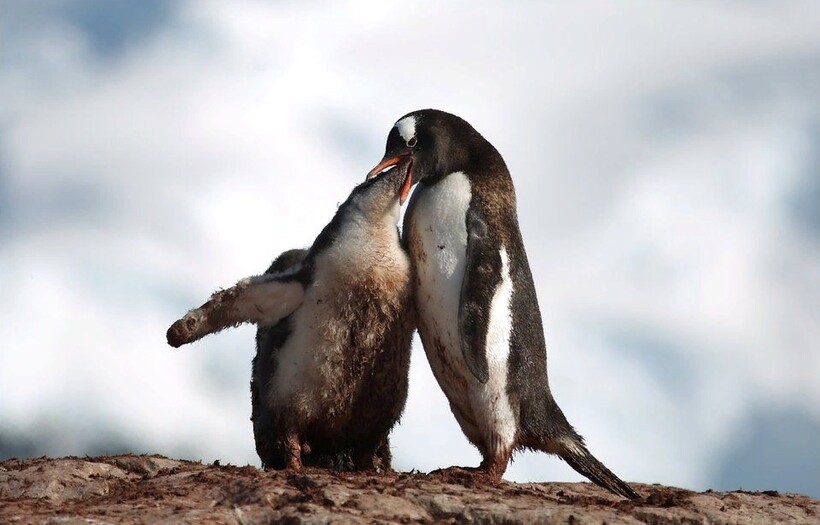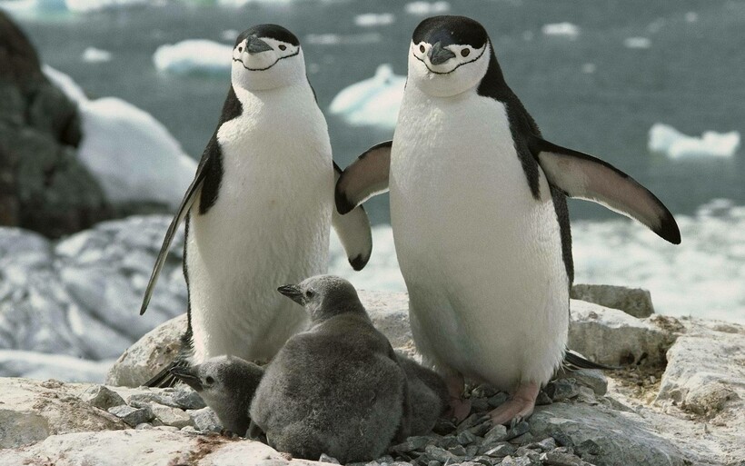 «Однако есть те, кто рад таким теплым переменам. Это другой вид пингвинов — с «ремешком» на подбородке. Они никогда бы не стали селиться там, где много поврежденного льда, но теперь им этот регион кажется симпатичным. Этот же факт привлекает на побережье морских слонов. Родители птенцов вынуждены плавать все дальше, чтобы найти еду для своих птенцов. Когда взрослый пингвин выплывает на берег со ртом, полным рыбы, он призывает своих птенцов, и они отбегают подальше в сторону, где родитель может спокойно накормить их подальше от голодных взоров и криков чужих детей. Обычно в пингвиньей семье два птенца, и любопытно, что первым кормят того, кто более настырно и агрессивно себя ведет», — говорит диктор.