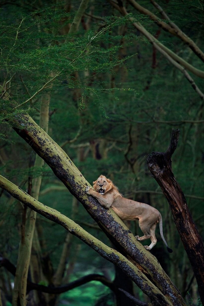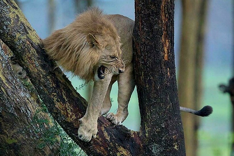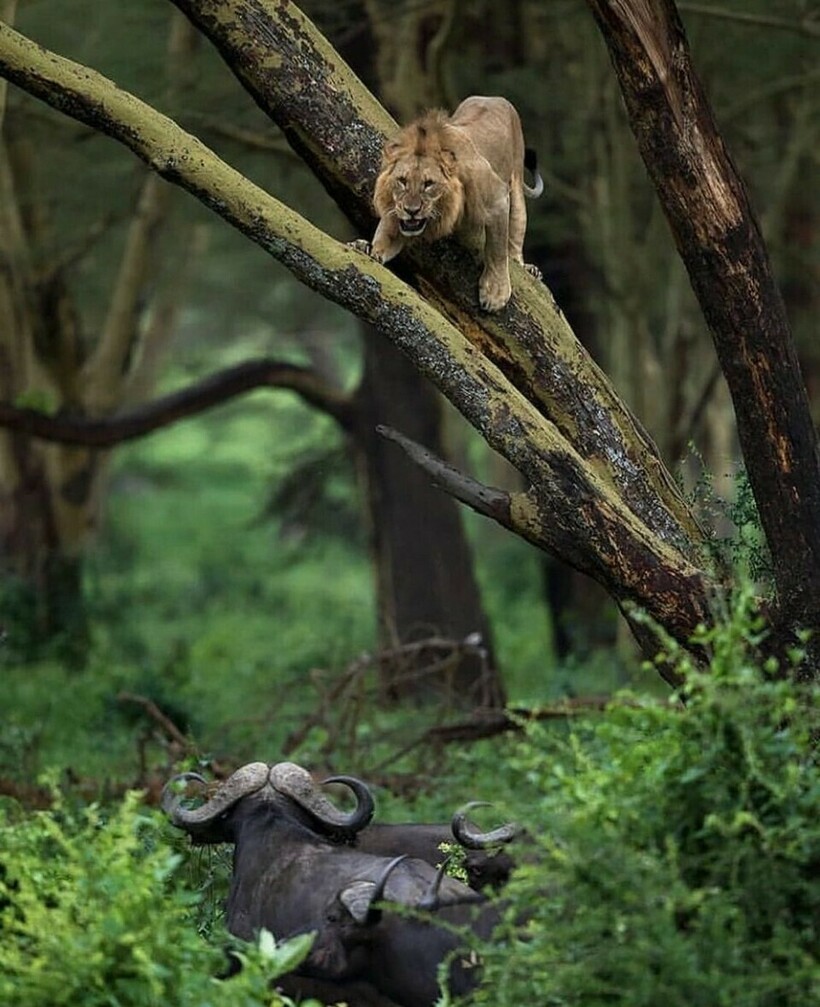 Здесь можно увидеть, как другой лев спасался от стада буйволов, карабкаясь на дерево.