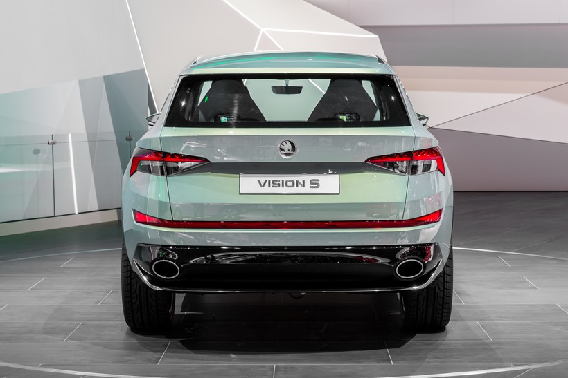 Задняя часть VisionS отличается отточенным скульптурным дизайном. Мощный диффузор примыкает к крупным выхлопным трубам, придавая внедорожнику впечатляющий внешний вид. Логотип SKODA и зауженные задние фары с тщательно очерченными кристаллическими элементами расположены под заниженным задним стеклом. Характерные для SKODA С-образные очертания прослеживаются во всем облике автомобиля — от задних фар до плоских отражателей на бампере.
