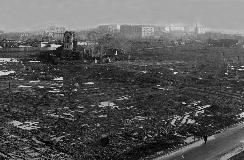 То, что осталось от села Черемушки в 1962 году (фото сделано с улицы Шверника), а обезглавленная сельская церковь обреченно ожидает сноса
