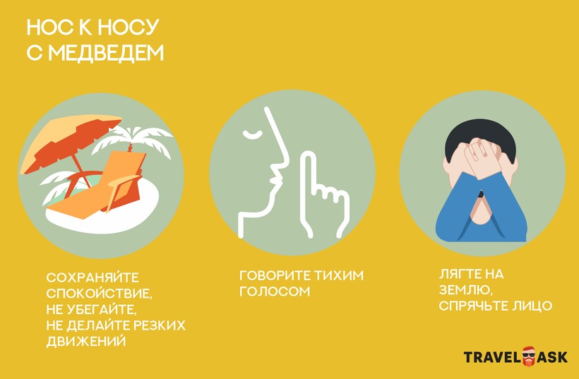 Главное — спокойствие. Будьте холодны рассудком, внимательны и терпеливы. Говорите с медведем спокойным голосом, постепенно отдаляясь от него по диагонали. При атаке падайте на землю лицом вниз, замрите. Не позволяйте хищнику перевернуть вас, старайтесь защитить лицо.