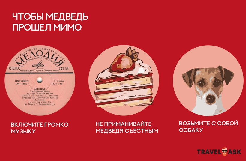 Зверь боится шумов, и ваша задача — стать их источником. Можно слушать музыку или громко разговаривать. Будьте аккуратны с едой. Медведи, как правило, очень голодны, и запах съестного может их легко привлечь. Отпугнуть медведя вам поможет собака, ведь зверь со зверем, как известно, все же поймут друг друга лучше, и реакция вашего питомца может напугать хищника.