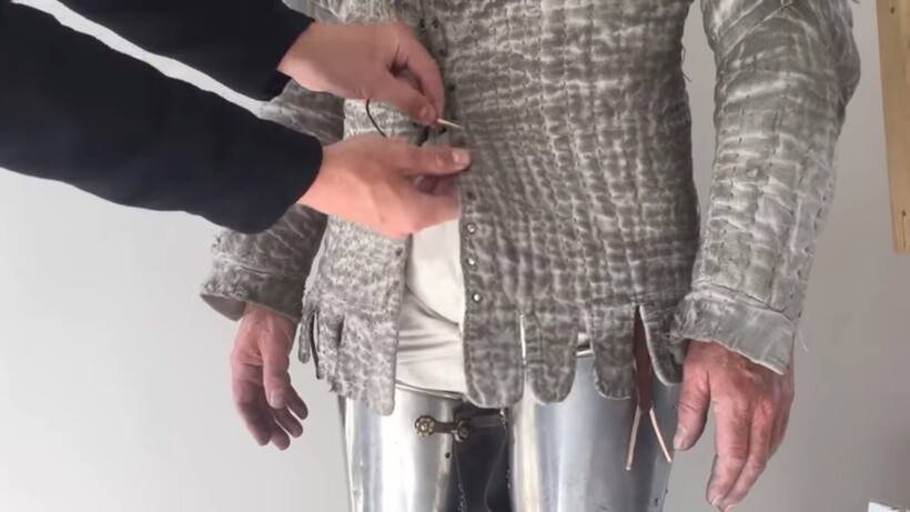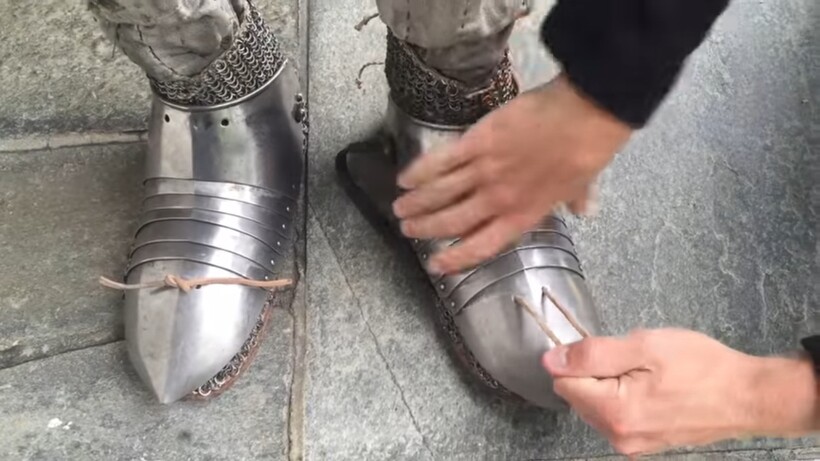 Рыцарю помогали одеваться, так как самостоятельно надеть такую экипировку не представлялось возможным. Обычно под доспехи надевали нательное белье и стеганую куртку. Поверх надевали кольчугу и броневой нагрудник. Ноги от колена до щиколотки защищали так называемыми поножами, а сверху прикрепляли наколенники и набедренники. Саму ступню защищали сабатоны — латная обувь того времени. На руки крепились налокотник, нижний и верхний наруч, которые закрывали предплечье и плечо. А надплечье перекрывалось небольшими пластинами. На голову надевали бацинет — самый популярный военный шлем того времени, снабженный воротником из кольчуги. А комплект завершала накидка, на которую крепился ремень, удерживающий оружие. Таким образом, эти доспехи закрывали все тело воина, защищая его от меча противника на поле битвы. Сложно представить, сколько времени уходило на то, чтобы подготовить рыцаря к бою?