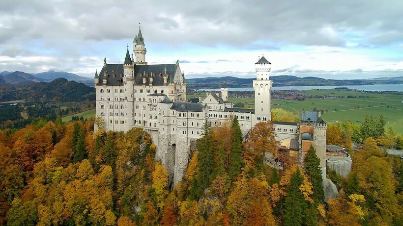 Замок Neuschwanstein в Баварии с его волшебным силуэтом из башенок с коническими крышами, ослепительно белыми фасадами из известняка и выдающимся положением на скалистой вершине холма — это образ из сказок, типичный замок в облаках.
