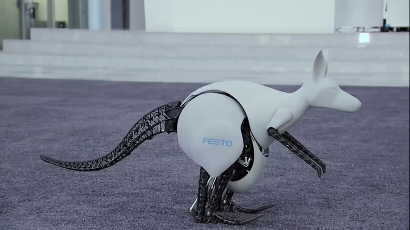 Компания Festo также показала миру робота-кенгуру, при создании которого использовала механизм рекуперации или накопление энергии от одного прыжка, чтобы сделать последующий. По такому же принципу существуют живые кенгуру, иначе бы они быстро уставали и не могли прыгать долго. Инженеры робота придумали пружины, которые могут сохранять механическую энергию при приземлении и отдавать ее при следующем прыжке. Управляется кенгуру при помощи манжеты, с которой робот считывает миоэлектрические сигналы.