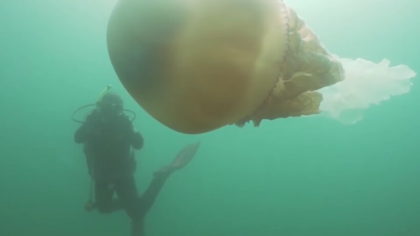 Многие люди боятся медуз, которых волной выталкивает на мелководье после шторма. Если же отплыть с маской подальше от берега, то можно увидеть медуз невероятного размера. Британские дайверы исследовали дно прибрежных вод около графства Корнуолл, и к ним решила присоединиться гигантская бочковая медуза. Эта медуза достигала в диаметре 90 сантиметров и весила около 35 килограммов. Несмотря на свои внушительные размеры, медуза вовсе не опасна для человека.
