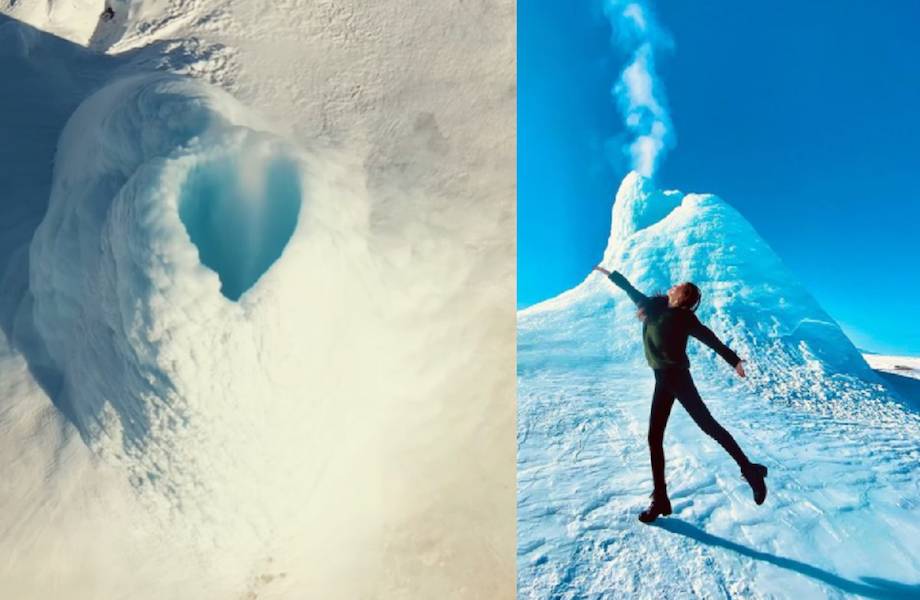 Эта белоснежная башня образовалась на месте водного источника. Летом он извергается фонтаном, а вокруг через какое-то время начинает все зеленеть. Зимой обычно появляется небольшая шапка из намерзшего льда. Но сейчас произошло что-то фантастическое: купол стал огромным, и до сих пор извергает воду вокруг, превратив всю территорию поблизости в естественный каток.