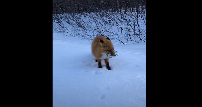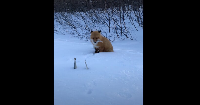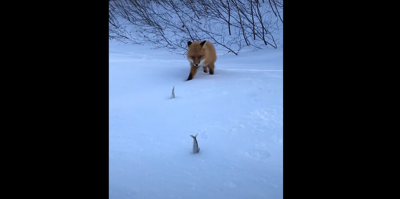 Когда рыбаки положили угощение на снег и отошли всего на пару шагов, лисица без раздумий схватила первую рыбку зубами и стала ждать. Когда же люди положили рядом еще пару рыбин, лиса схватила все три рыбы и понесла подальше от любопытных глаз. Видео еще необычно тем, что чаще всего лисы проявляют активность с наступлением сумерек, а днем предпочитают отсыпаться в норах. Однако запах рыбы и факт даровой добычи может выманить плутовку из укрытия и даже заставить забраться в рыбацкую сумку, как показано в другом видео.