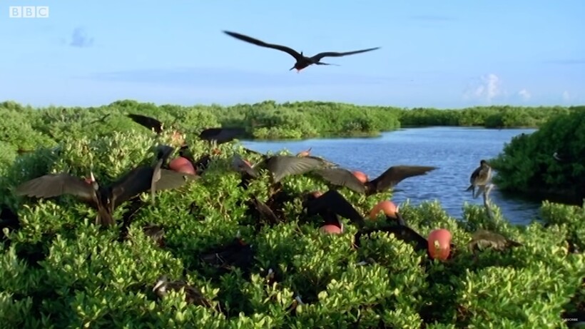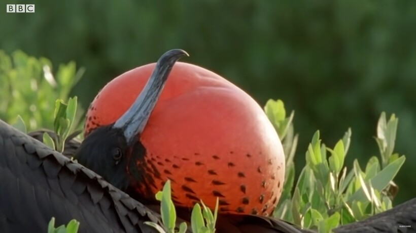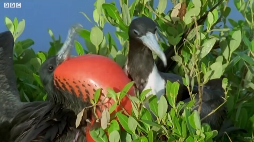 Тоненькая красная кожица надувается так, как будто ребенок надувает воздушный шарик. В таком состоянии фрегат ждет самку. Когда они прилетают, то не сразу спускаются вниз, они кружатся поверх самцов, выбирая из всех самого красивого. Их красный мешочек — это символ их силы и мужского достоинства. Также они начинают размахивать крыльями и трещать, подзывая к себе пернатую особу.