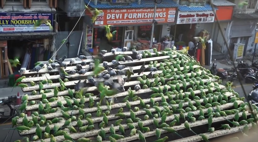 «В этом маленьком городе в Ченнаи мы нашли этого парня, которого зовут Джозеф Сега. Он кормит полчища птиц каждый день, но для начала позвольте вам рассказать, с чего все началось. В 2004 году мощное цунами обрушилось на Ченнаи. Многие люди погибли, а животные потеряли свои дома. Четверо из них были птицами, и им пришлось мигрировать, чтобы найти новый источник пищи. Так они оказались на крыше Джозефа. Он решил помочь птицам и угостил их едой, и пернатые улетели», — говорит диктор.