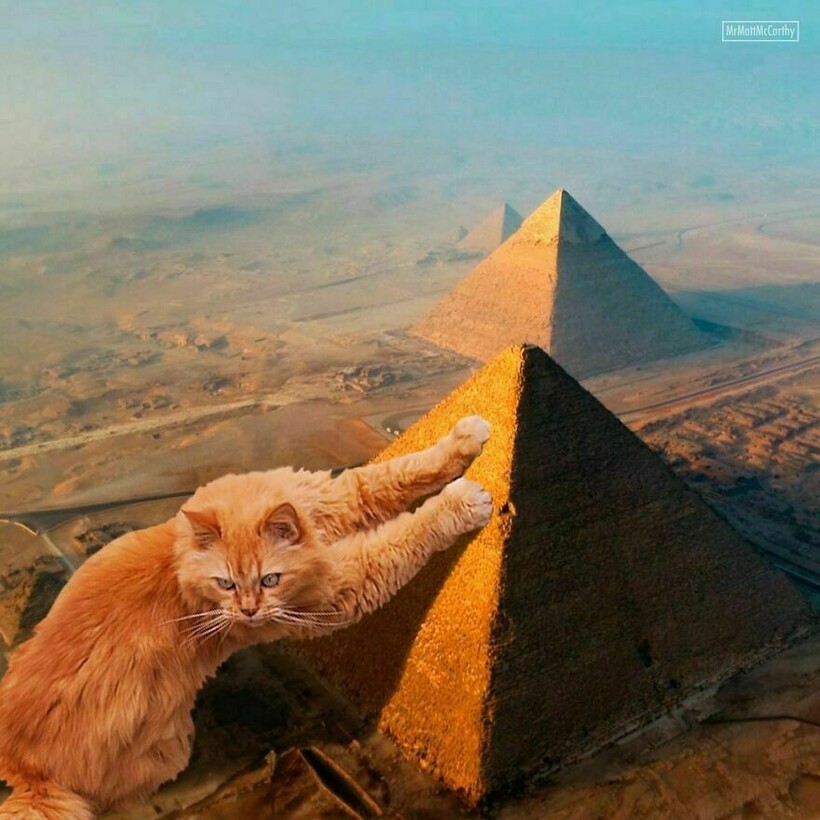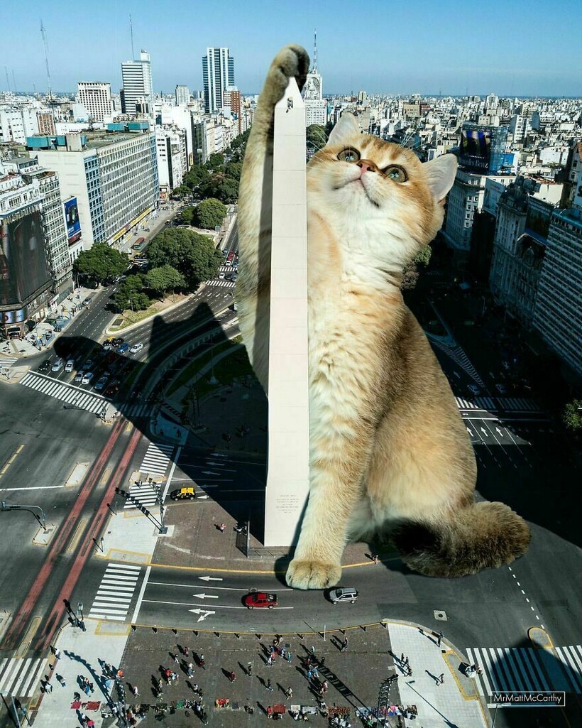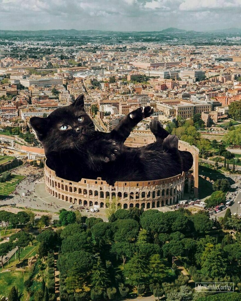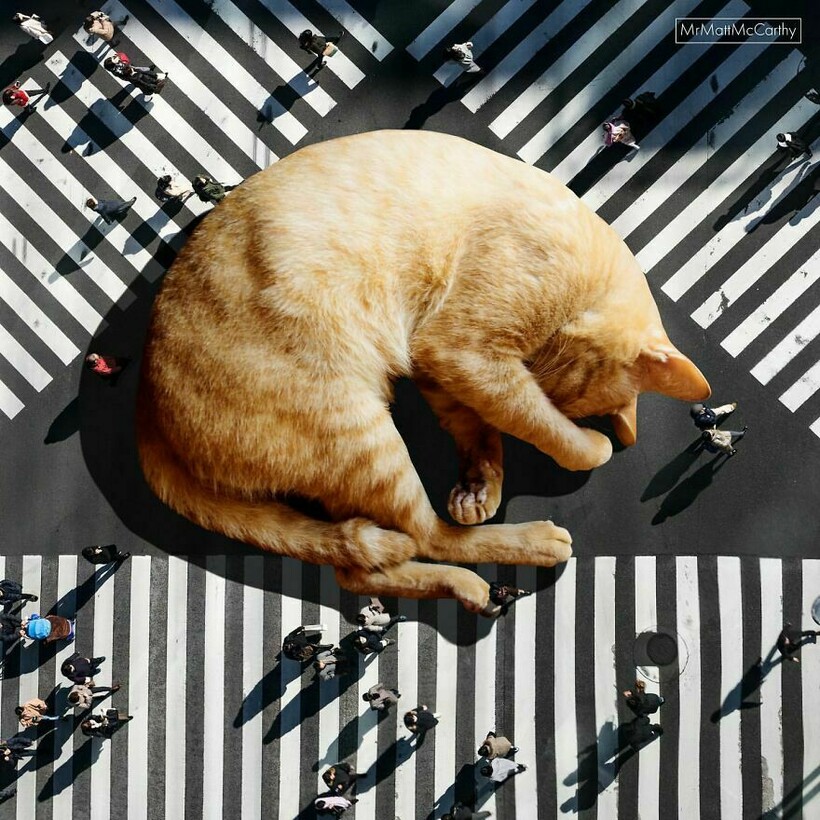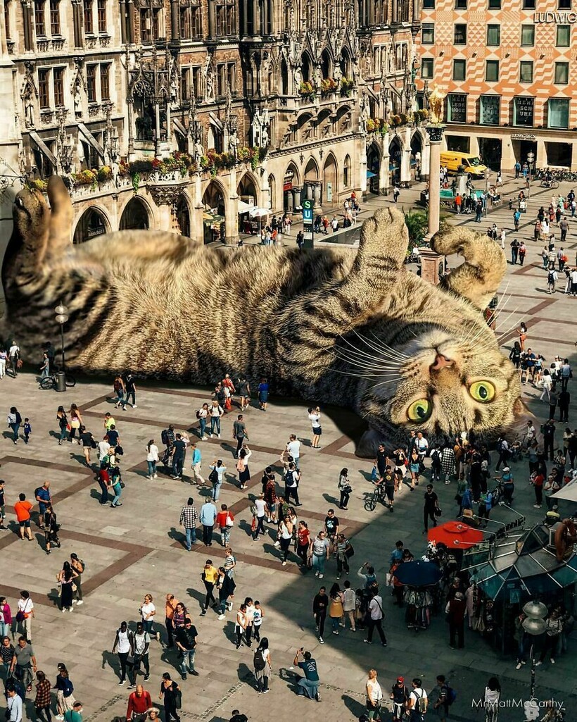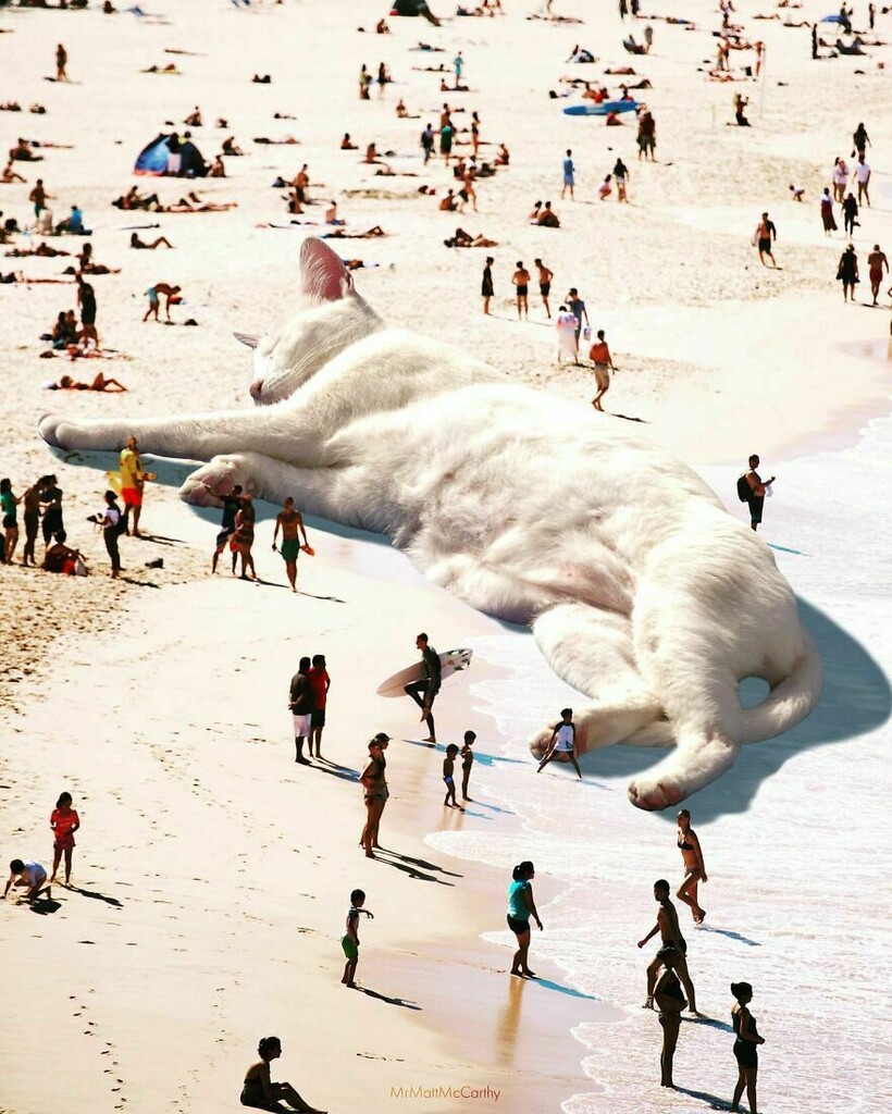 Как думаете, вписались бы коты-гиганты в наш мир? Мэтт Маккарти решил поэкспериментировать с этим предположением и превратил обычных кошек в настоящих великанов. Они живут у Мэтта у известных достопримечательностей, на улицах мегаполисов, на пляжах, все так же свернувшись клубочком или усердно точа когти. У самого Мэтта тоже живут кошки, они-то его и вдохновили на этот необычный проект.