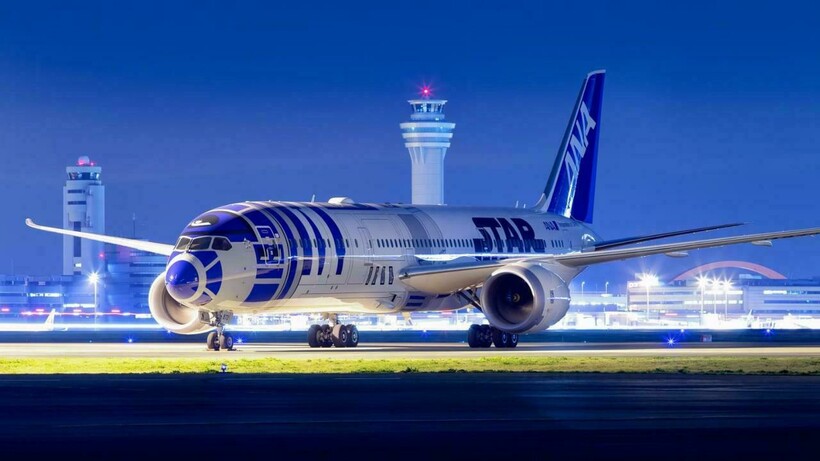 Здесь у входа на борт должны быть расставлены штурмовики, а напитки развозить — знаменитые дроиды, так как облик самолета выполнен в стиле «Звездных войн».