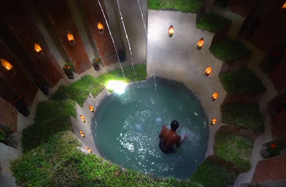 На ступеньки он аккуратно выкладывает траву с корнями, чтобы она прижилась на новом месте. Отверстие вверху мужчина закрывает бамбуком, который сверху засыпается глиной. Самый сложный этап работы — провести в бассейн воду. Поблизости источника воды не оказалось, поэтому пришлось проводить бамбуковые трубы прямо от родника. Ближе к вечеру бассейн официально объявлен готовым. Мужчина зажигает свечи в нишах и с удовольствием принимает водные процедуры в живописном подземном бассейне. А вы бы могли поверить в то, что построить такое под силам одному человеку?