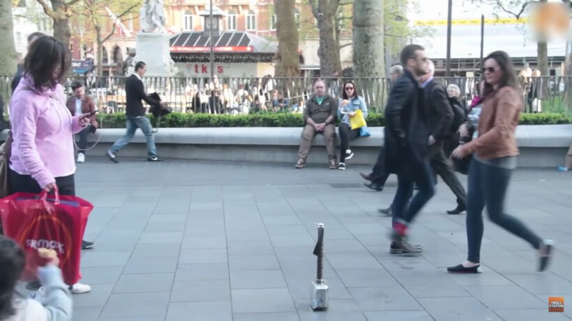 Другим супергероям, наверное, очень обидно, что молот им не покоряется. Даже всесильный Халк не раз брался за рукоятку молота, но все его попытки не закончились успехом. Одному известному пранкеру пришла в голову интересная идея для розыгрыша. Он нашел точную копию молота Тора из фильма и приклеил ее к плитке в одном из самых людных мест. Представьте, какое искушение — попытать свои силы и взяться за него. У прохожих молот вызвал необычайный ажиотаж.