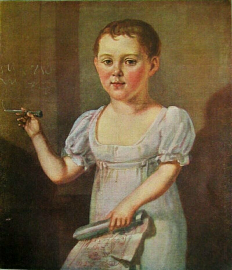 Еще один знаменитейший русский поэт на своем детском портрете изображен в достаточно странном наряде, напоминающем платье для девочек. Но дело в том, что это было нормальным явлением для детской одежды в XIX веке. Маленький Миша обожал рисовать, и как раз художник запечатлел его с мелком в руках. Бабушка Лермонтова долгое время противилась увлечению внука, но когда он регулярно стал изрисовывать весь пол своей комнаты изображениями животных, капитулировала. И купила Мише его первые акварельные краски, которые тот принял с восторгом, еще больше увлекшись рисованием.