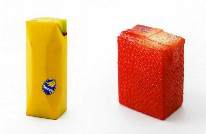 В рекламах по телевидению часто показывают, как пьют кокосовую воду прямо из кокоса. А что насчет сока прямиком из фрукта, из которого и получили этот сок? Вот такие нестандартные коробочки для сока существуют: киви, банан и даже клубника.